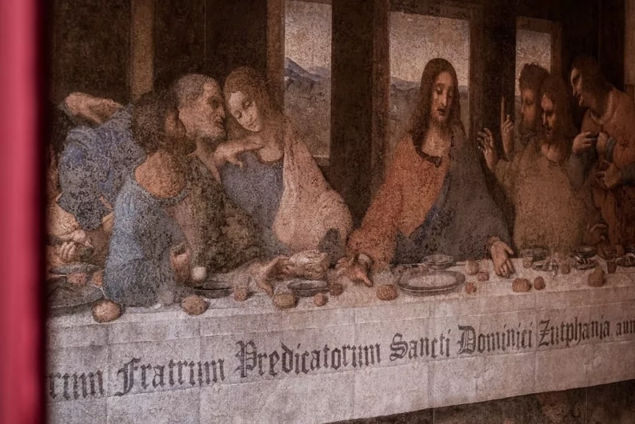 Waarom is er gekozen voor Het Laatste Avondmaal? Het Laatste Avondmaal is door vele kunstenaars afgebeeld op schilderijen en hing traditioneel op de muur van een kloostereetzaal. De versie van Leonardo da Vinci is één van de beroemdste muurschilderingen ter wereld. Het is te bewonderen in de voormalige eetzaal van een monnikenklooster in Milaan. De muurschildering laat een scène zien van Het Laatste Avondmaal, zoals beschreven wordt in de Bijbel. Jezus zegt daar tegen zijn apostelen dat er een verrader in hun midden is, zonder te zeggen wie. Meestal werd Het Laatste Avondmaal op dezelfde manier afgebeeld: alle apostelen en Jezus gebroederlijk naast elkaar, en de foute apostel Judas apart. Leonardo da Vinci zette Judas bewust gezellig tussen de andere apostelen in. Dat is toch een veel leuker beeld om naar te kijken tijdens een overheerlijk diner?