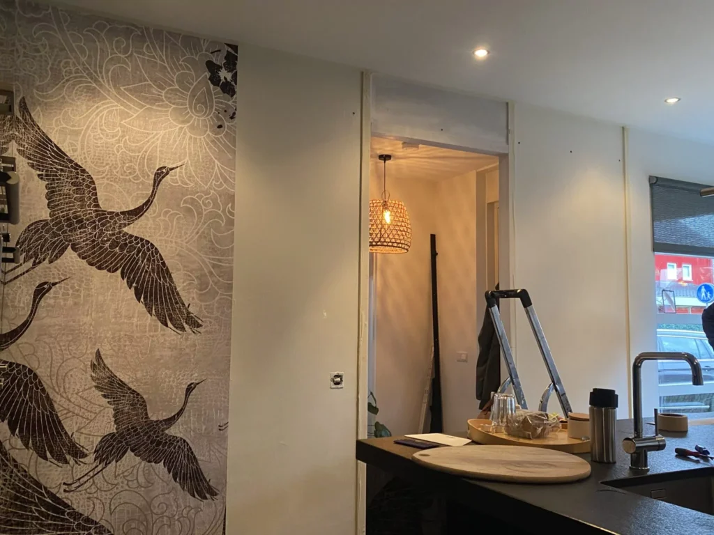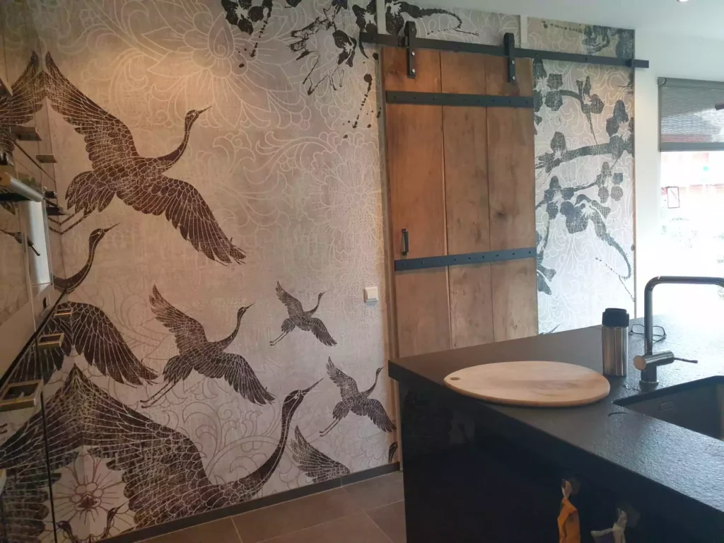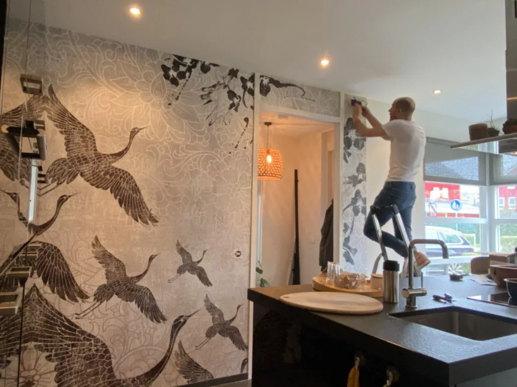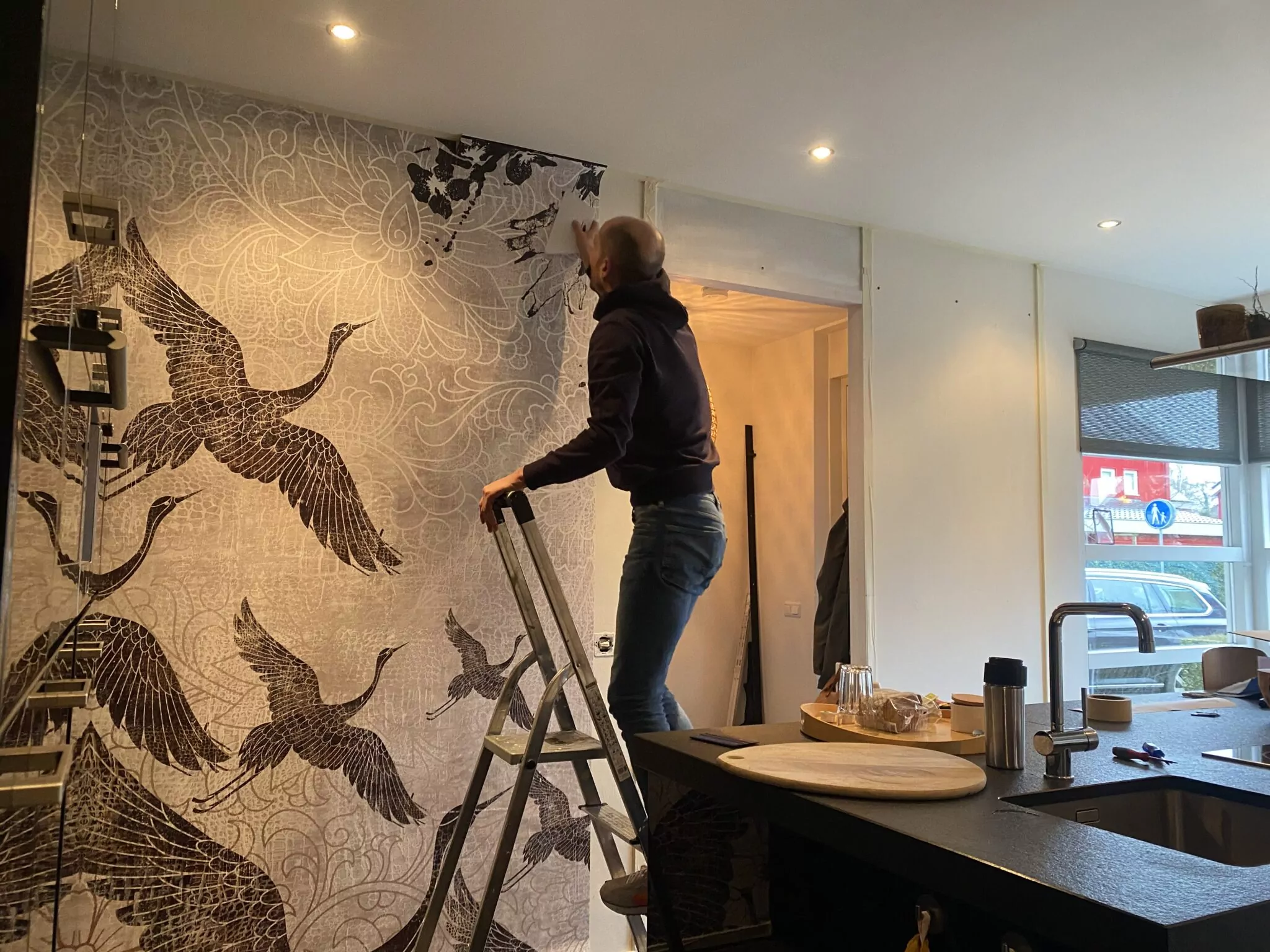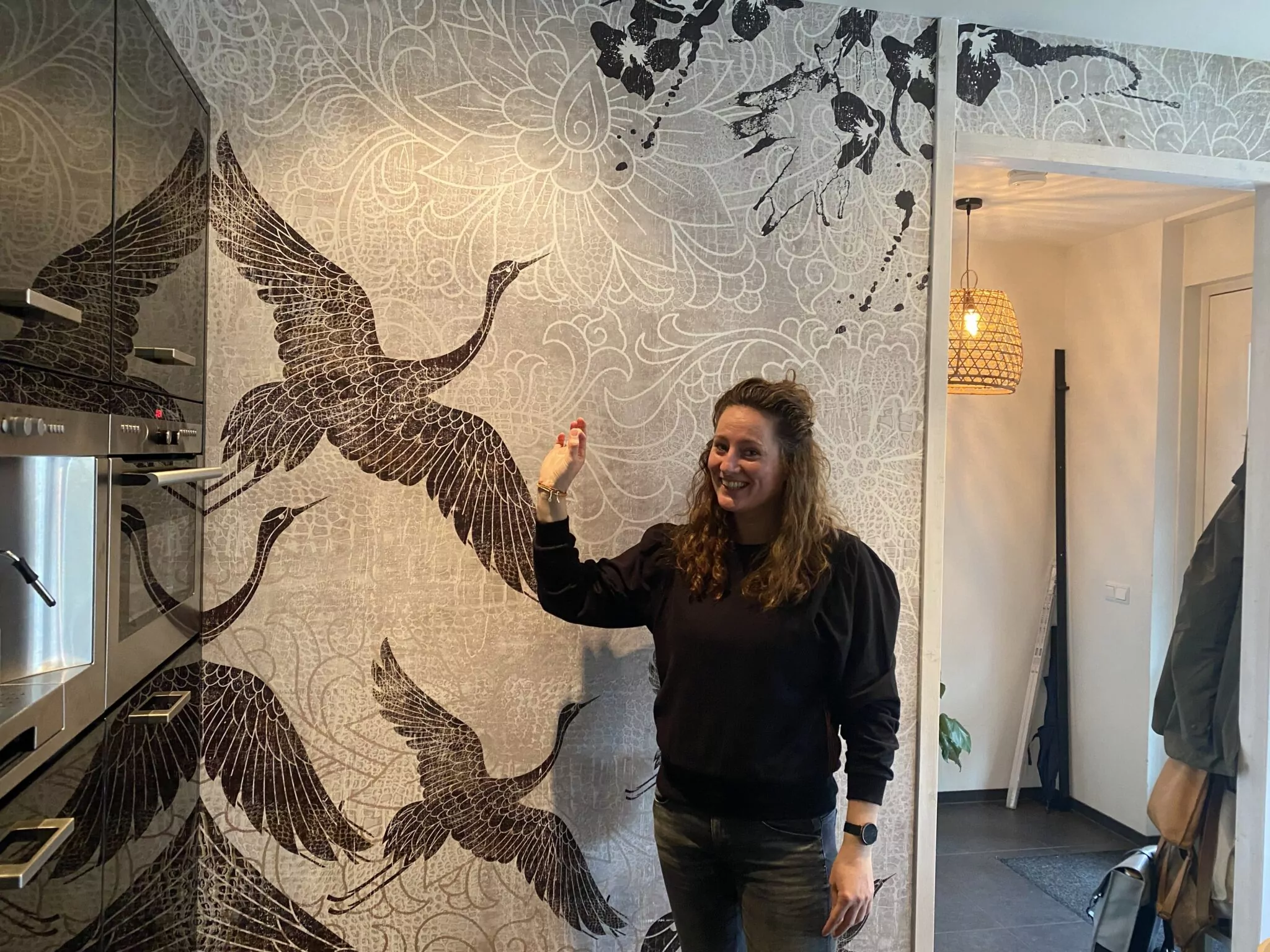 Kraanvogels staan in veel culturen symbool voor geluk, lang leven en liefde & trouw en worden bovendien gezien als de boodschapper van vrede. Geen wonder dat deze prachtige elegante vogel nu ook steeds vaker in ons interieur neerdaalt. Karin: “Wij zijn heel blij met het kraanvogelbehang in onze keuken. Die ziet er nu compleet anders uit en ik vind het leuk dat ons interieur hiermee een subtiele Aziatische touch heeft gekregen. De keuken is een plek geworden waar we nu nog liever onze tijd doorbrengen met vrienden en familie.”