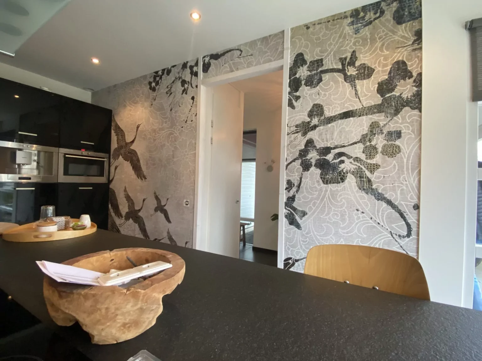 Harry en Karin uit Zutphen wilden in hun moderne zwarte leefkeuken luxe en een rustgevende sfeer creëren. Tijdens de zoektocht naar luxe en stijlvol behang kwamen ze terecht bij Wonderwall Wallcoverings. Karin: “Het kiezen van behang vond ik best lastig, er is zoveel keuze dat je op een gegeven moment door de bomen het bos niet meer ziet. Omdat we echt op zoek waren naar iets unieks, besloten we samen de Unique Wonders te gaan bekijken. Ons oog viel al snel op het behang met de vliegende sierlijke kraanvogels.”